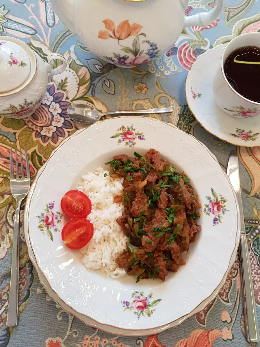 Азу подают с вареным рисом, посыпанным свежей зеленью укропа и петрушки. Это блюдо станет отличным угощением как для повседневного стола, так и для праздничного застолья. Приятного аппетита!