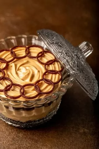 На дно чаши выкладывается первый бисквит, пропитывается 10 г кофе и покрывается 30 г крема. Второй корж также пропитывается, затем укладывается джем и снова крем, посыпается кедровыми орехами. Завершает сборку третий корж, который необходимо также пропитать и покрыть оставшимся кремом.