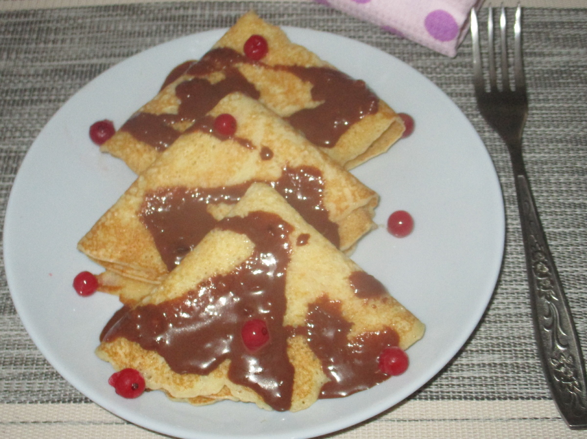 Блины можно подавать с шоколадной пастой, которая будет отличным акцентом в этом блюде. Чтобы сделать сервировку более красочной, добавьте свежие ягоды красной смородины. Такой завтрак не только насытит, но и подарит прекрасное настроение на весь день!
