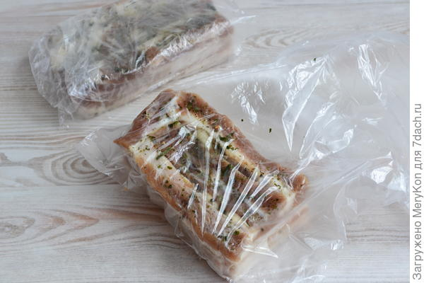 - Установить пакет с салом на тарелку, чтобы при выделении сока ничего не утекало.